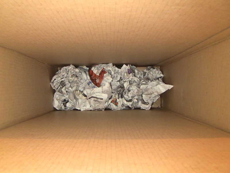 Prepare the box by taping one end shut first. Drop one good layer of newspaper balls in the bottom of the box.