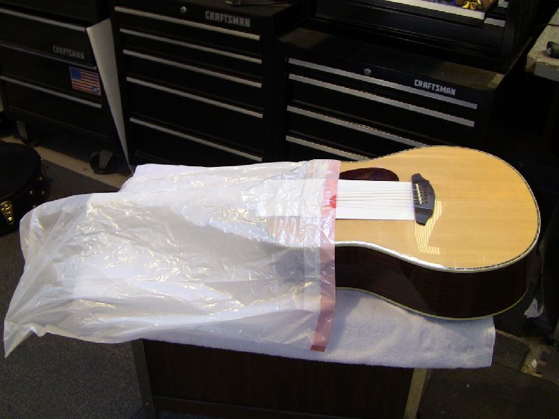 If you have one plastic bag that the guitar will fit in, carefully slide the guitar in the bag body first and tie the bag shut at the headstock. If you have to use two bags, pull the first bag over the headstock and the second bag over the body and over the neck bag as far as it will go. Wrap this bag around the neck and tape the two bags together so they are sealed.