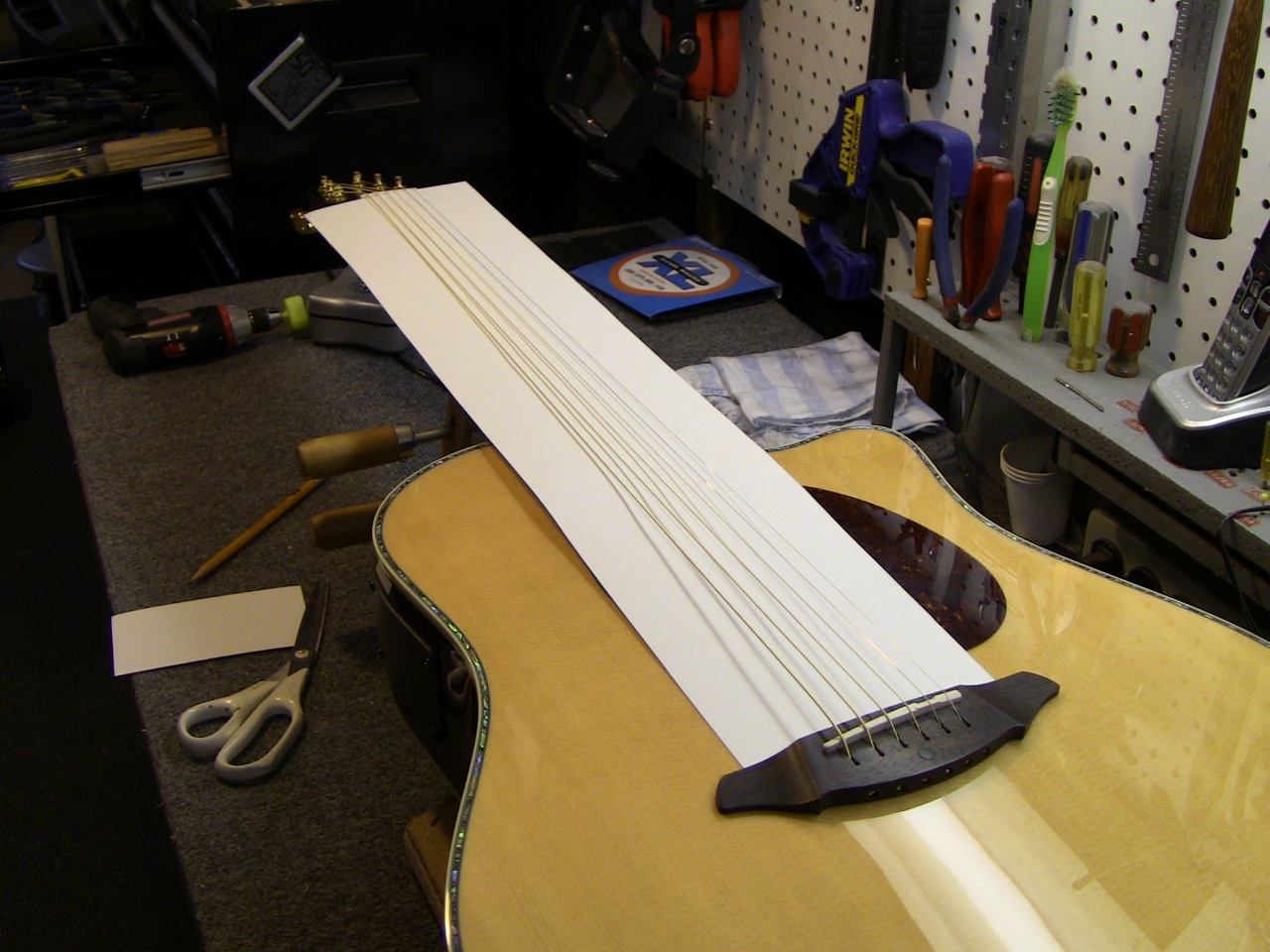 Remove the guitar and place it on a large flat area coverd with a terry cloth towel. Using the thin cardboard (poster board), cut a piece that will stretch from the nut to the bridge, between the strings and the neck and body of the guitar. Cut the cardboard about twice the width of the neck. If you have to tape pieces together, make sure the taped sides are up toward the strings. Do not let the tape rest against the guitar neck or body.
