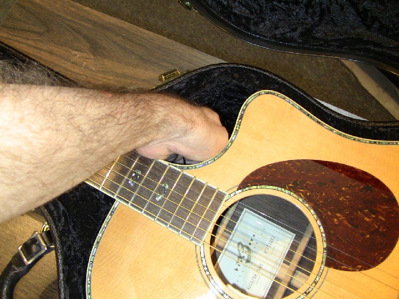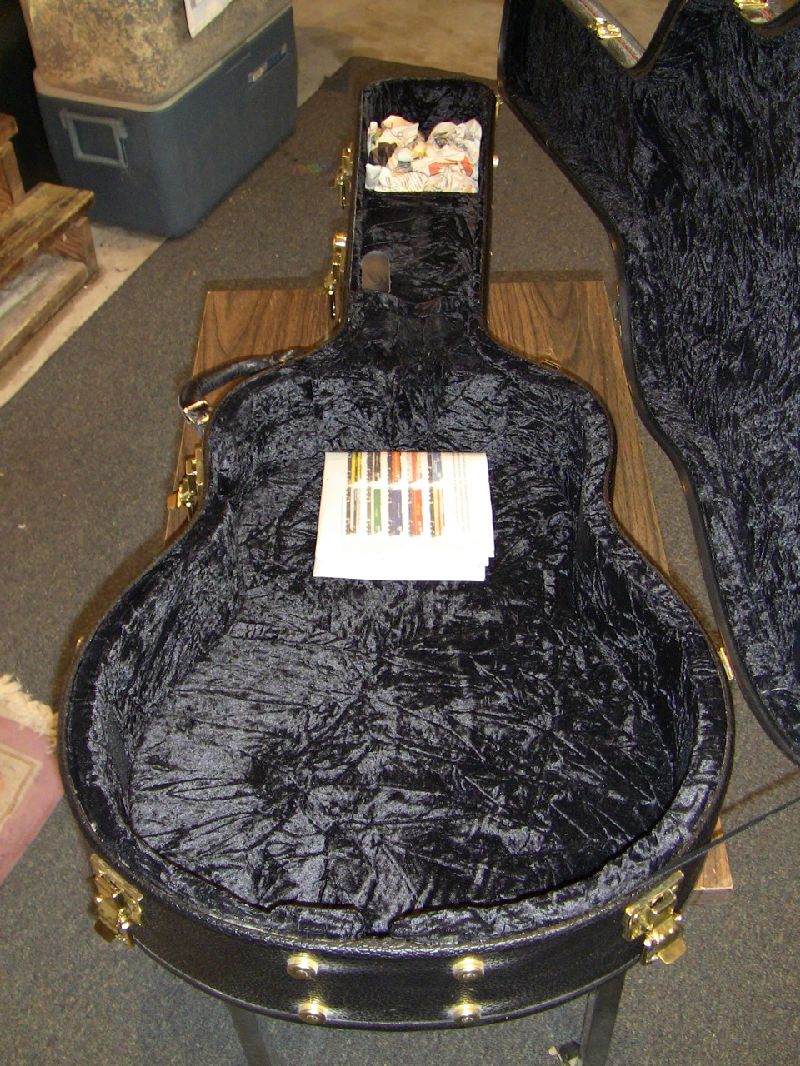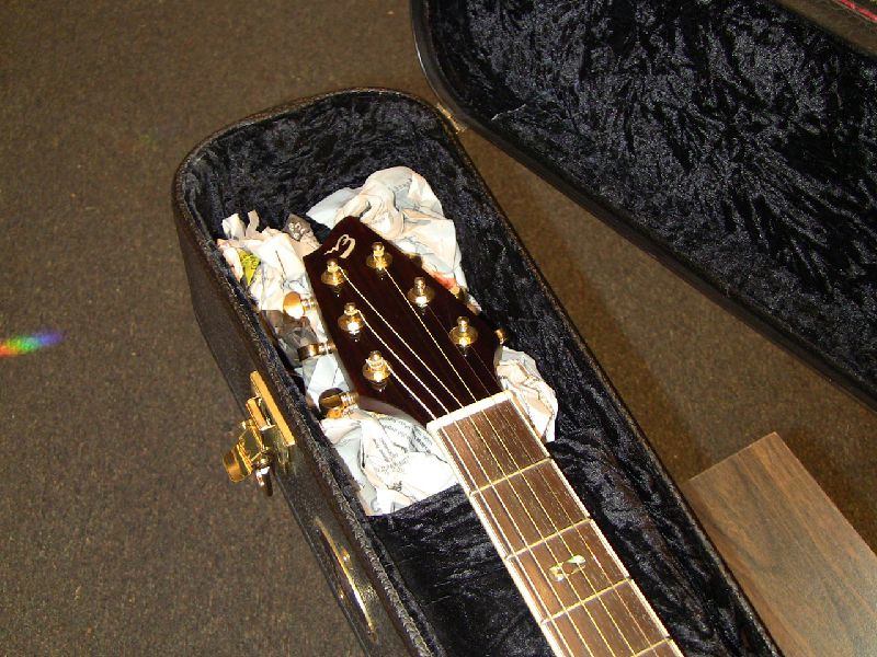 Close the case making sure there is no excessive pressure to get the lid shut. If there is more than light pressure to close the case, lift the guitar out and remove some of the padding between the back of the guitar and the bottom of the case at the neck joint. Put the guitar in the case and close the latches.